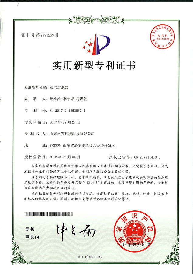 近日,山東水發(fā)環(huán)境科技有限公司申報的“淺層過濾器”獲國家實用新型專利證書。