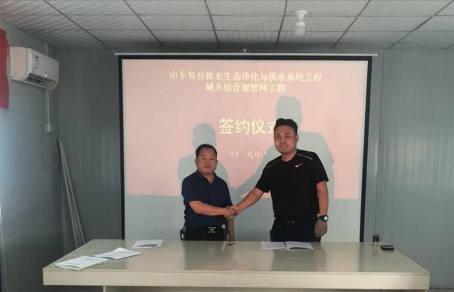 5月21日下午,山東魚臺原水生態(tài)凈化與供水系統(tǒng)工程城鄉(xiāng)結(jié)合部管網(wǎng)工程施工簽約儀式在魚臺縣順利舉行。水發(fā)金水建設工程有限公司總經(jīng)理蘇福貴、山東水發(fā)賢達水務有限公司總經(jīng)理潘愛國出席并簽訂了合同。
