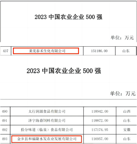12月20日,“2023年中國(guó)農(nóng)業(yè)企業(yè)500強(qiáng)”榜單正式發(fā)布,水發(fā)農(nóng)業(yè)集團(tuán)2家權(quán)屬公司首次上榜。萊蕪泰禾生化有限公司位列第437位,金鄉(xiāng)縣和福隆水發(fā)農(nóng)業(yè)發(fā)展有限公司位列第493位。