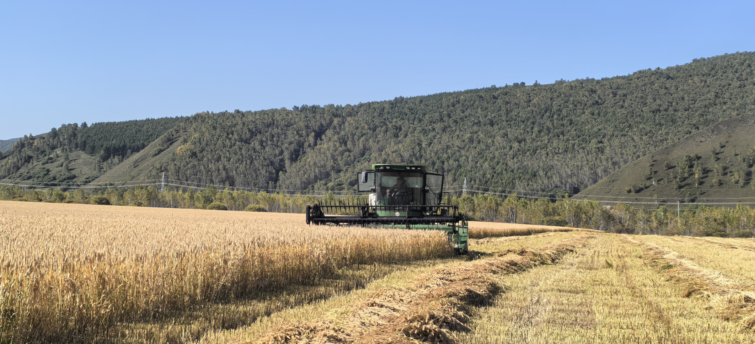 田間作業(yè)現(xiàn)場,割曬機(jī)械正在有序推進(jìn)作業(yè)。伴隨著機(jī)器的轟鳴聲,一排排小麥被整齊割倒,等待后續(xù)的拾禾與脫粒。阿爾山水發(fā)農(nóng)技人員穿行在田間地頭,手持測量儀器,仔細(xì)查看小麥的成熟度、倒伏率以及田間水分狀況,并不時(shí)與農(nóng)機(jī)手溝通,調(diào)整作業(yè)節(jié)奏,確保收割效率與質(zhì)量并重。