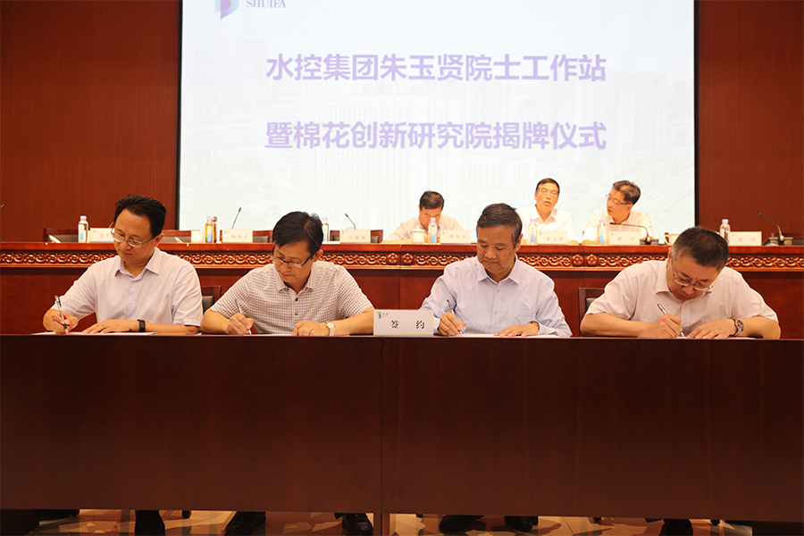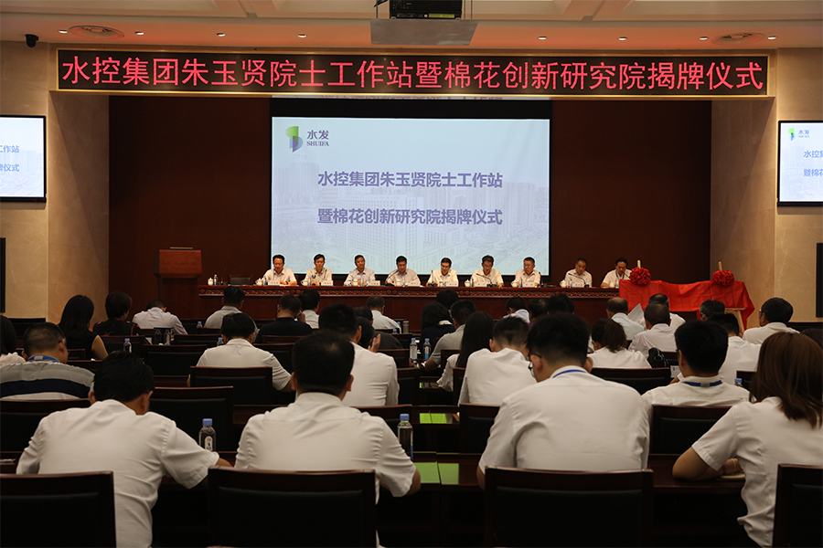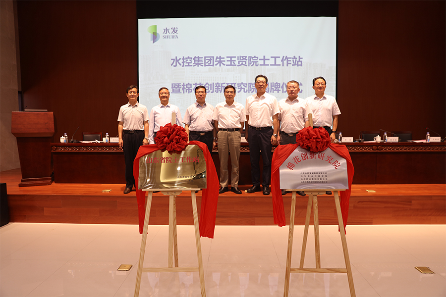 隨后,朱玉賢、潘軍、劉肖軍、吳東振、王西奎、劉琦、楊丙生一同為水控集團朱玉賢院士工作站和棉花創(chuàng)新研究院揭牌。