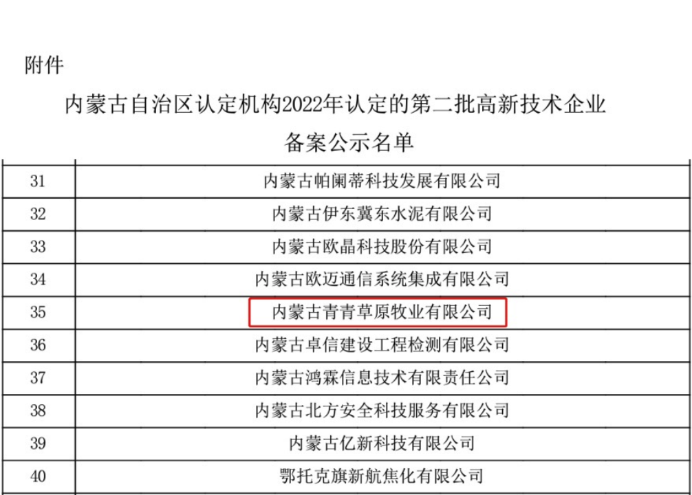 12月1日、12月14日,全國高新技術企業(yè)認定管理工作領導小組辦公室分別公布了河南省2022年第一批高新技術企業(yè)備案通知和內(nèi)蒙古自治區(qū)2022年第二批高新技術企業(yè)備案通知,內(nèi)蒙古青青草原牧業(yè)有限公司及權屬子公司河南中羊牧業(yè)有限公司均成功入選。