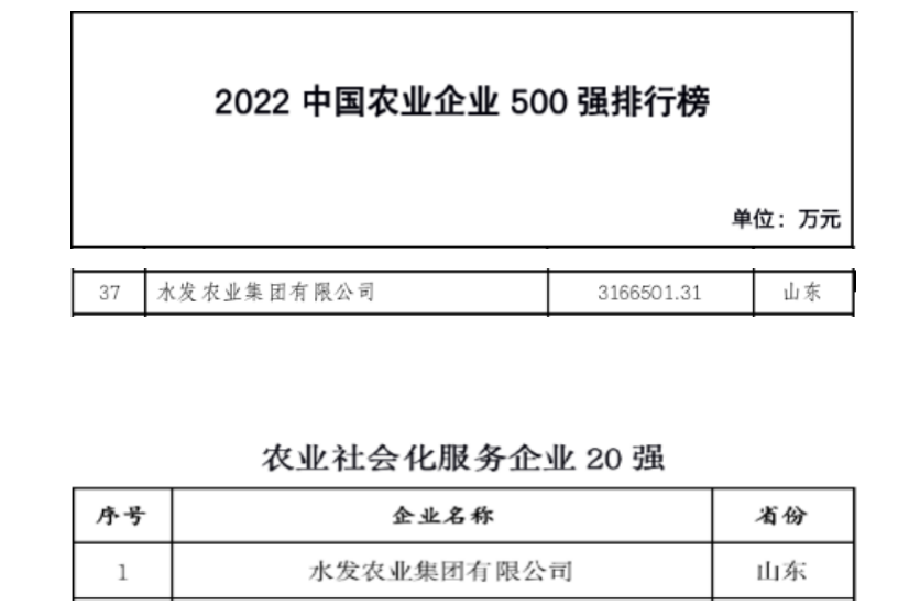 12月23日,“2022中國農業(yè)企業(yè)500強”榜單正式發(fā)布,水發(fā)農業(yè)集團有限公司(以下簡稱“水發(fā)農業(yè)”)榮登“2022中國農業(yè)企業(yè)500強”榜單,排名第37位,較去年上升46位。同時,水發(fā)農業(yè)還入選了“農業(yè)社會化服務企業(yè)20強”榜單,排名第1位。