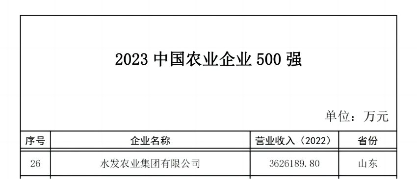 12月20日,“2023年中國(guó)農(nóng)業(yè)企業(yè)500強(qiáng)”榜單正式發(fā)布。水發(fā)農(nóng)業(yè)集團(tuán)位列第26位,較去年提升11位。
